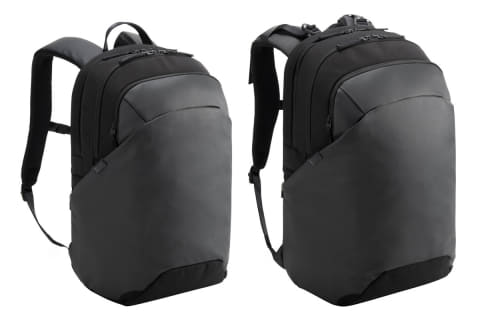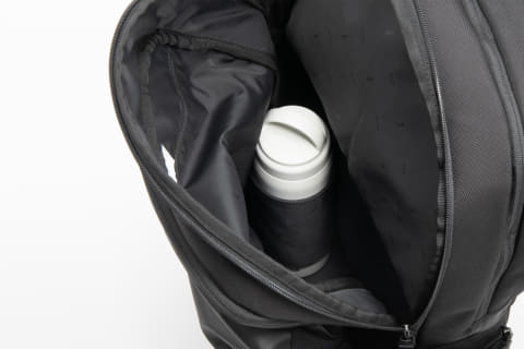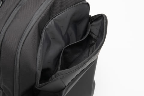 フロントポケットは、衣類などのかさばる荷物を収納でき、メッシュ素材のファスナーポケットとクッションスリーブを装備。メインコンパートメントには書類などのビジネスツールを収納でき、内装にファスナーポケットとボトルホルダーを装備する。