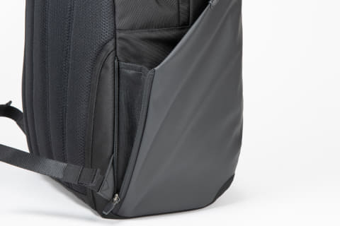 PC収納部は、内側の一部に柔らかな起毛生地を使用。サイドポケットはファスナーを開くと吸水速乾生地を採用したマチが拡がり、厚みのある水筒や折り畳み傘も収納できる。