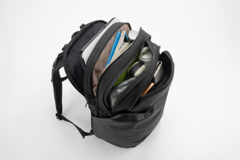 リュック内部のスペースを活用し、衣類・ビジネスツール・小物雑貨・ノートPC・水筒といった、用途の異なる荷物を仕分けて整理できる「5収納構造」を採用。それぞれの収納スペースが異なる役割を持ち、必要なものをすぐに取り出せる。