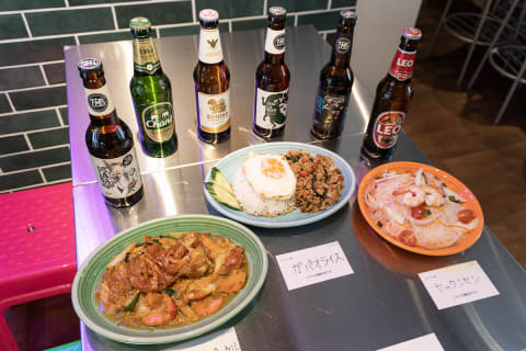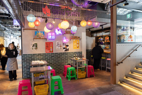 バンコクの街角をイメージしたネオンの光が煌めく装飾のタイ料理店。