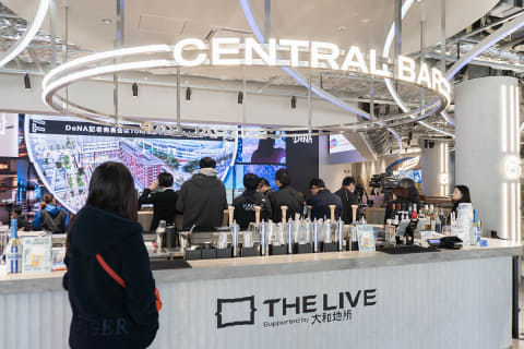 ザ ライブ内の中心に位置するドリンク専門のカウンター。ベイスターズ・ラガーをはじめとした限定ビールや、ワイン、シャンパンなどをラインアップ。