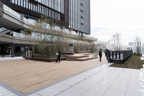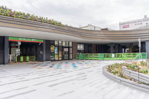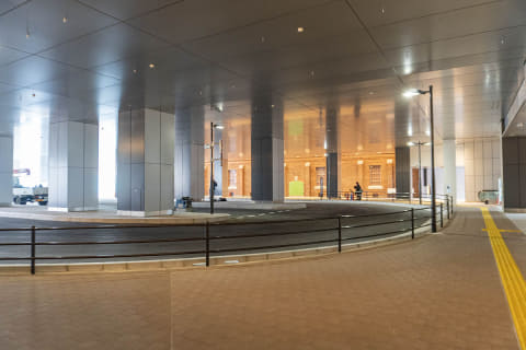 トラックス口を出て目の前には、ショップエリアやホテル・住宅タワーの入り口にもなる広場「ステーションプラザ」がある。大井町駅周辺には待ち合わせなどに使える滞留スペースがないという課題を解消するとともに、山手線車両基地を見下ろせるビュースポットとしても展開する。
