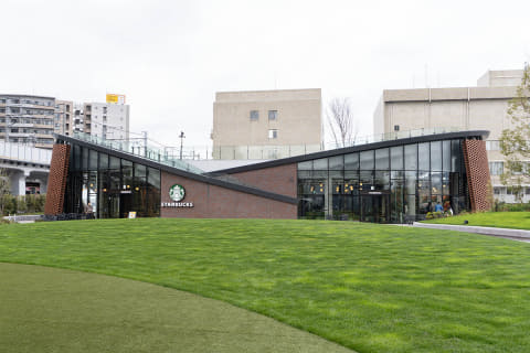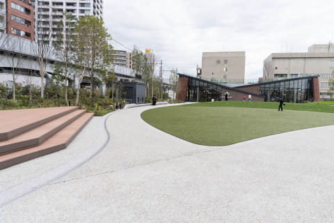 駅から2棟を挟んで反対側の、大井町トラックスの西端には3つ目の広場「トラックスパーク」がある。人工芝と天然芝の両方が使われているが、これは天然芝のメンテナンス期間は入れなくなってしまうため、常時開放できるように人工芝のエリアも設けた。