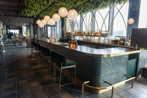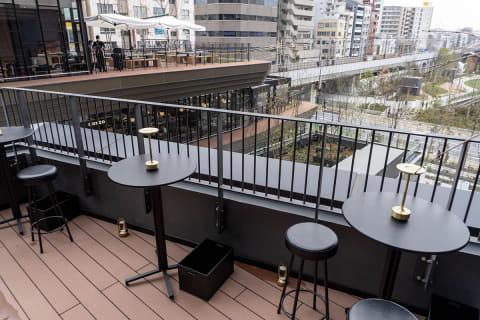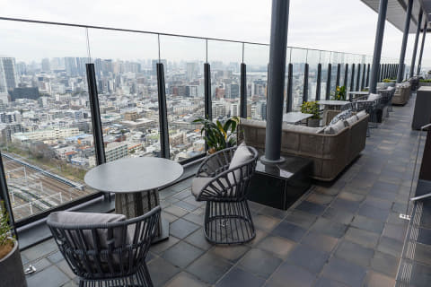 26階・地上100mの高さとなる「The TRAVELERS HOUSE ROOFTOP BAR」のテーマは「森の秘境」。屋外のテラス席からは山手線車両基地を真上から眺められ、夜には「都心の煌めく夜景と眼下の車両基地」を楽しめるとしている。