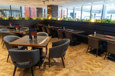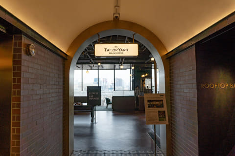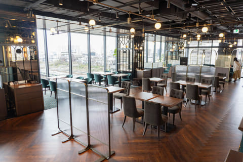 5階のレストラン「The TAILOR YARD MAIN DINING」は、鉄道旅をテーマにしたオールデイダイニング。ヨーロッパの食堂車をイメージしたボックス席やカーゴ席を設えた、旅情あふれる空間とした。窓の外には山手線車両基地の景色が広がる。