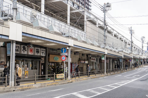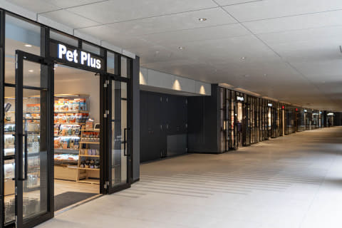 商業エリアは、改札口~トラックスパークの道に沿う路面店スタイルで展開。2階~4階および5階の一部に、飲食、物販、サービス、スーパーマーケット、クリニックなどが出店する。スーパーは「ライフ」。