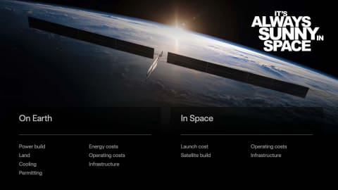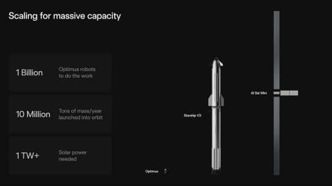 マスク氏は、地球だけではなく宇宙、特に太陽の力を使うことを強調し、そのためのSpaceXのスターシップによる高頻度な打ち上げと大きなペイロード(積載能力)が必要と説明。太陽のエネルギーをコンピューティングに活用するためには、データセンターや発電設備、ロボットのOptimusを宇宙に送り出していく必要があるとする。