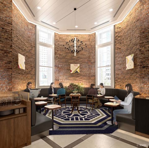 天井5mの空間に、100年以上の時を刻んだ重要文化財の構造レンガ壁を構え、重要文化財である駅舎の歴史的質感を肌で感じながら、日常から離れて思索をめぐらせられる唯一無二の空間とする。座席の足元には、東京駅特有の八角形天井を模した特注カーペットなども備える。