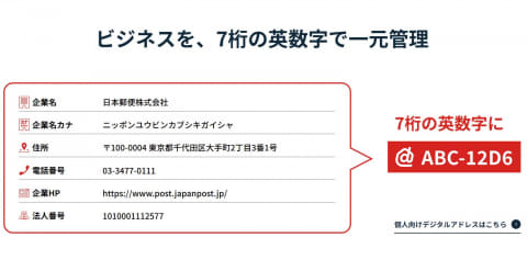 日本郵便、会社住所・URL・法人番号などを7桁で表現「ビジネスデジタルアドレス」