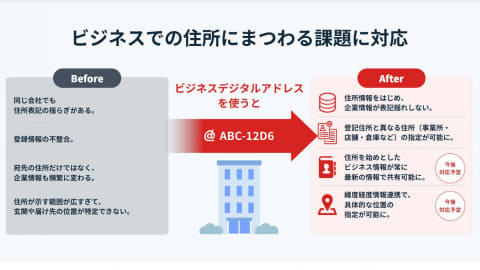 ビジネスデジタルアドレスは、法人・個人事業主を対象に、住所情報のほか、社名、社名カナ、電話番号、会社ホームページ(URL)、法人番号など、ビジネスに関する複数の情報を7桁の英数字で表現する。事業者等は無料でアドレスを取得・利用でき、登記上の本店所在地に限らず、オフィスや店舗などの所在地も柔軟に登録できる。企業のビジネス情報をワンストップで取得・管理できるため、業務効率の向上や管理コストの削減が図れるという。