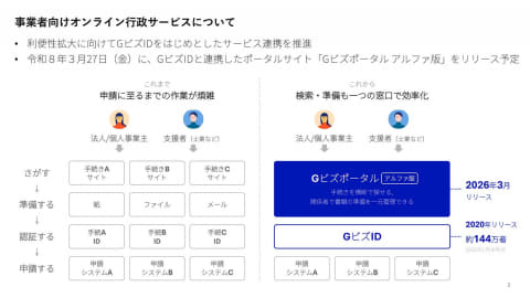 デジタル庁は、事業者向けオンライン行政サービス「Gビズポータル」のアルファ版を3月27日から開始する。「GビズID」と連携し、事業者における行政サービスの窓口となるサービスを目指す。