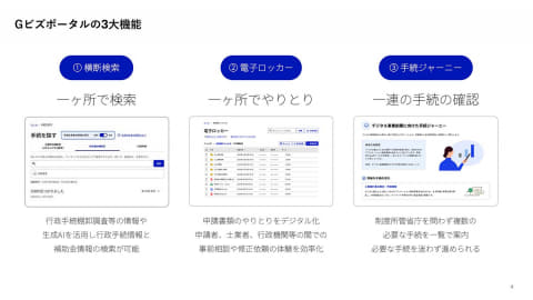 行政サービスを利用するための事業者向けID「GビズID」を活用する。GビズIDは3月末時点で144万IDが発行されているが、この基盤を活用し、多くの手続きをオンラインで行なえるようにする。Gビズポータルの主な機能は、「横断検索」「電子ロッカー」「手続きジャーニー」の3つ。