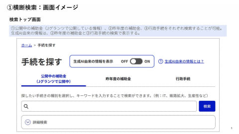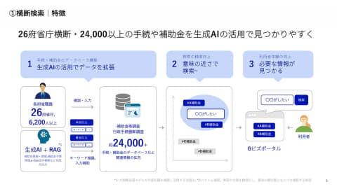 横断検索は、26府省庁横断・24,000以上の手続や補助金を生成AIを活用しながら、わかりやすく整理するもの。Gビズポータルから各省庁の補助金申請などを探しやすくする。