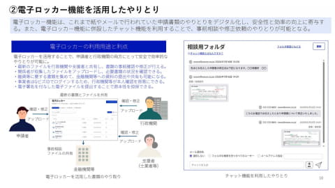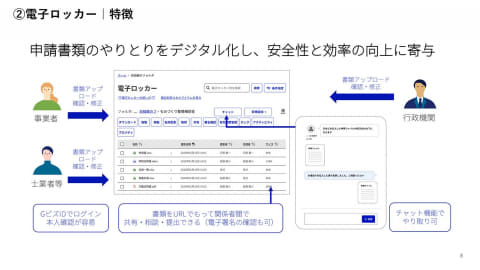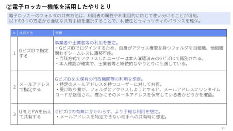 GビズIDでログインするため、本人確認が容易となるほか、これまで紙やメールで行なっていた、申請書類のやりとりをデジタル化し、安全性と効率の向上を図る。電子ロッカー機能を活用したやりとりは「GビズIDで指定する」「メールアドレスで指定する」「URLとパスワードを伝えて共有」の3種類が用意される。