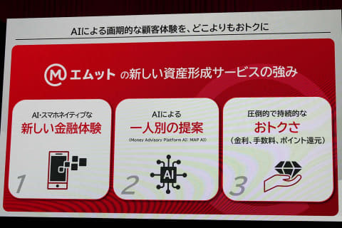 新会社によるサービスは、エムット経済圏の中核として、デジタルバンクとともに、おトクな資産形成環境(預金金利、ポイント還元、優遇手数料)などを提供。また、AI/スマホネイティブなUI/UXによりデジタルバンクアプリで、銀行と証券の垣根を感じずに直感的に操作できるようにする。
