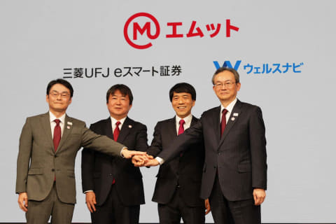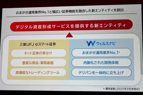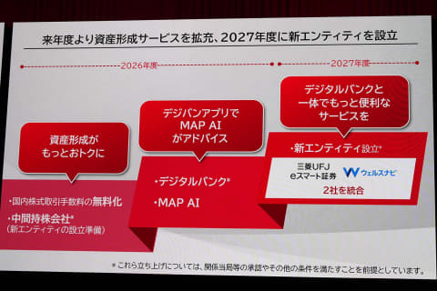 新たなデジタル資産形成サービスの名称は未定だが、2026年度中に三菱UFJ eスマート証券とウェルスナビを束ねる中間持株会社を設立し、統合に関する意思決定を一体化。その後、本格的な経営統合に向かう。