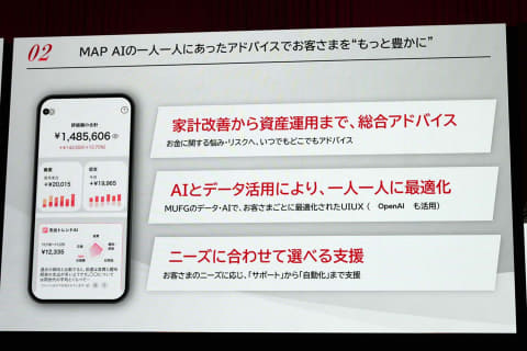MAP AIでは、グループ共通ID基盤によるデータ分析や、AIなどを活用した個別最適UI/UXを提供。AIが家計管理や取引の自動化など、お金の運用を支援する。