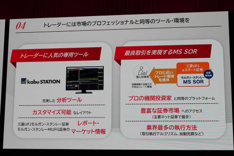 より幅広い投資については、フル機能の証券アプリから利用可能となるほか、トレーディングツールなども提供。対面のサポートを受けたい場合は、三菱UFJモルガン・スタンレー証券への連携も行なう。