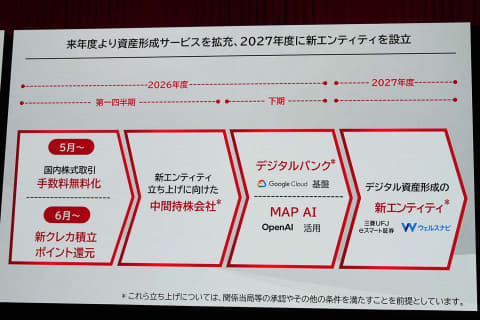 なお、新社名やデジタル資産形成サービスのサービス名は未定。2026年度の新デジタルバンクでは、まずウェルスナビのサービスがデジタルバンクに統合されるほか、MAP AIなどの機能がデジタルバンクアプリで利用可能となる。