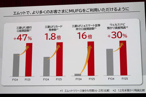 三菱UFJフィナンシャルグループでは、25年6月から「エムット」の展開を開始し、MUFGのリテール戦略をエムットに集約してきた。グループサービスを連携して使うことで、多くの特典が得られるなどの特徴を訴求した結果、三菱UFJ銀行の口座開設は前年同期比47%増、三菱UFJカードの発行枚数は同1.8倍、三菱UFJ eスマート証券の仲介口座開設は16倍、ウェルスナビの預かり残高は同30%増など大きく成長したという。