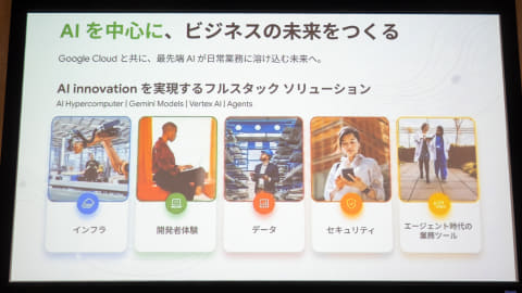 また、Google Cloudの強みとして、TPUやGPUなどのチップセットから開発基盤、AIモデル、アプリケーションまでをフルスタックで自社開発している点を挙げた。そのうえで、2026年度のビジョンとして「AIの力でともに創ろう、ワクワクする日本の未来を。」を掲げ、パートナー企業とともにテクノロジーを形にし、日本企業の変革に貢献していく姿勢を示した。