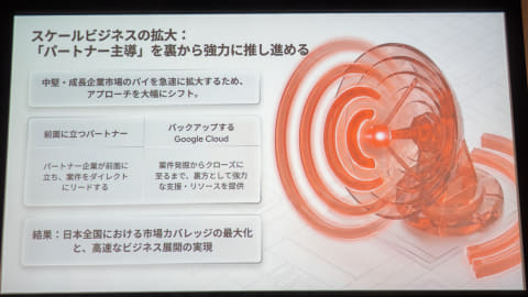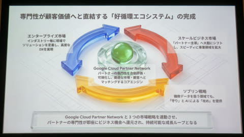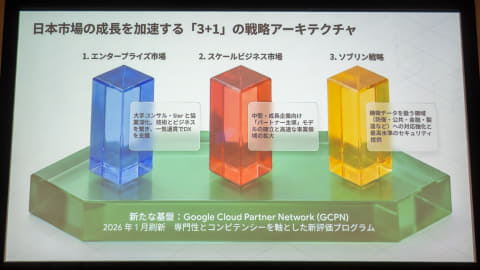 日本市場の成長を加速させるための市場戦略としては、「エンタープライズ市場」「スケールビジネス市場」「ソブリン戦略」の3本柱と、それらを支える新パートナープログラム「Google Cloud Partner Network」による「3+1」の戦略を展開する。
