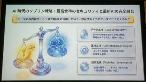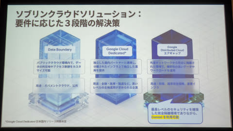 ソブリン戦略では、デジタル主権への関心の高まりを踏まえ、データ主権と運用主権の両立を図るセキュアなソブリンクラウドを提供する。提供形態は顧客のセキュリティ要件に応じて、「Data Boundary」「Google Cloud Dedicated」「Google Distributed Cloud エアギャップ」の3段階を想定する。