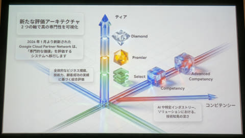 これらを支える基盤として、1月に刷新したGoogle Cloud Partner Networkでは、事業の広さと深さを評価する「ティア」に最上位の「Diamond」を新設したほか、技術や業界に対する深い専門性を認定する「コンピテンシー」という評価軸を追加。評価プロセスにはAIを活用し、自動化と透明性の向上を図ることで、パートナーの専門性がより迅速にビジネス機会につながる仕組みを整えた。