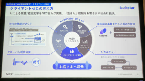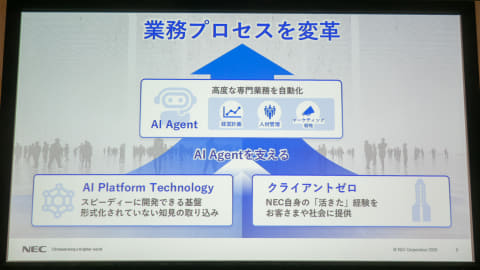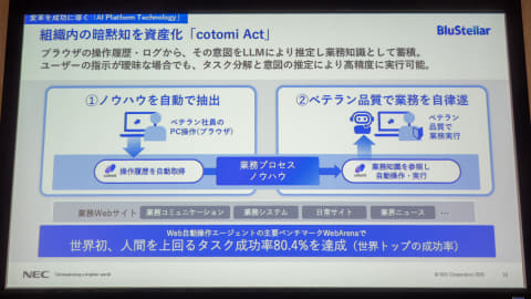 また、AIエージェントの導入を加速させる基盤としてGoogleの技術を活用した「NEC Agent Platform」や、ブラウザ操作履歴やログから人間の意図をLLMで推定し、システム操作のノウハウをAI-Readyなデータへ変換する「cotomi Act」も紹介した。