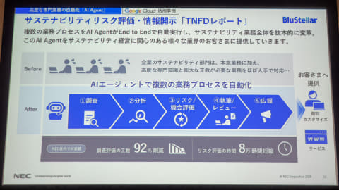 NECではTNFDレポート作成において、社内に散在する活動情報の調査や分析、リスク評価までをAIエージェントが担い、人間は監査に集中する体制を構築。その結果、社内では調査・評価工数を92%削減し、リスク評価に関わる時間を8万時間削減したという。