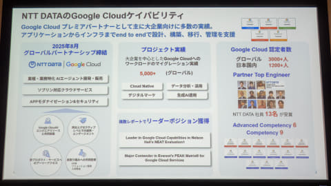 新谷氏は、NTTデータがGoogle Cloudと連携し、AIを起点とした事業変革を進めていると説明。同社は2025年8月にグローバルパートナーシップを締結し、業界特化型エージェントの開発・販売やソブリン対応、モダナイゼーションを推進しているという。グローバルで5,000件を超えるプロジェクト実績も強みとして挙げた。