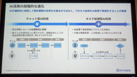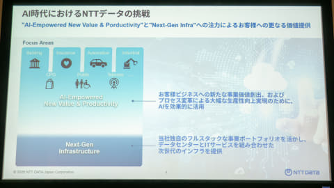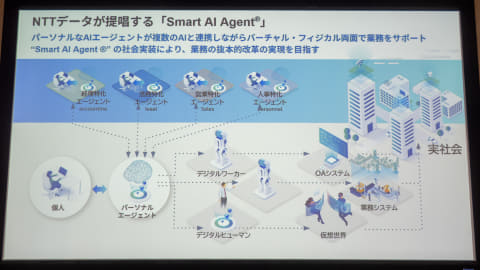NTTデータはAI時代において、AIによる業務変革と、それを支える次世代インフラ整備の2つに注力している。業務変革では「Smart AI Agent」構想のもと、複数のAIエージェントが連携しながら業務全体を自律的に進める世界を見据える。