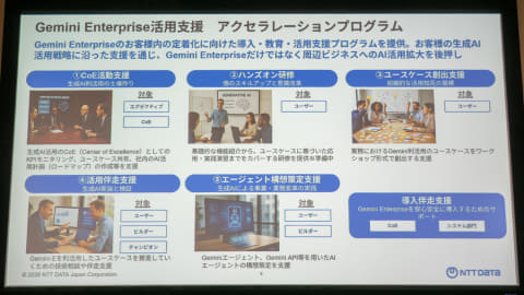 同社は、GeminiやGoogle Workspaceなどを活用し、企業の業務システムと連携したAIエージェント環境の構築を進めるほか、Gemini Enterpriseの活用支援プログラムも展開している。