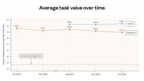一方、ユースケースは多様化し、米国の労働者における、Claude上で行なわれた作業の平均経済価値はわずかに低下したという。これは、スポーツ、製品比較、住宅メンテナンスに関する個人のクエリが増加したことが要因で、早期にClaudeを導入した人はコーディングのような高付加価値用途で使い、後発の導入者はより幅広いタスクに取り組んでいるため。