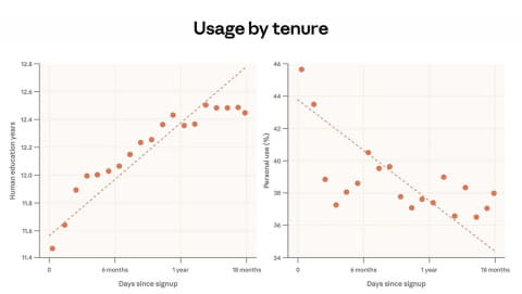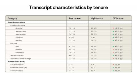 レポートが示しているのは、Claudeをより長く使用しているユーザーほど、新規ユーザーと比べて望ましい回答を引き出す能力が高いこと。経験豊富なユーザーほど、Claudeをより協働的に扱い、業務上のより複雑なタスクに適用し、成功裏に活用できる傾向が確認されている。
