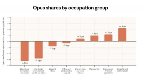 Claude.aiでは、ソフトウェア開発者のタスクの34%がOpusを利用しているのに対し、家庭教師のタスクで12%にとどまる。タスクの時給が10ドル増えるごとに、Claude.aiユーザーにおけるOpusを使用した会話の比率は1.5ポイント増加するという。APIではさらに傾きが大きく、タスク価値が10ドル増えるごとにOpusの割合が2.8ポイント増加する。