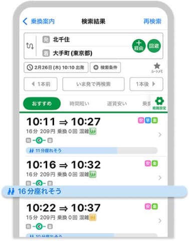 これまでのルート検索では「早く着くこと」「乗り換えが少ないこと」「運賃が安くなること」が優先されていたが、「座るための別ルート」に着目した。「1本後の列車を待つ」「急行ではなくあえて普通列車に乗る」などで座りやすくなる場合、検索結果にそのルートが追加で提案される。