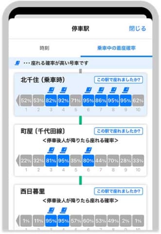 「停車駅ごとの着座確率表示」は、乗車する駅から目的地までの停車駅ごとの着座確率を表示する。