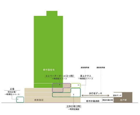 そのほか、広場、帰宅困難者対応施設、防災備蓄倉庫、自家発電設備などを整備し、居住者・施設利用者だけではなく、地域住民、来訪者等の災害時対応を実施する地域防災活動拠点の形成を目指す。