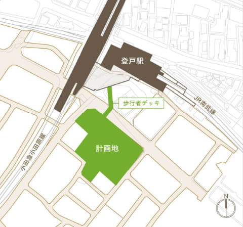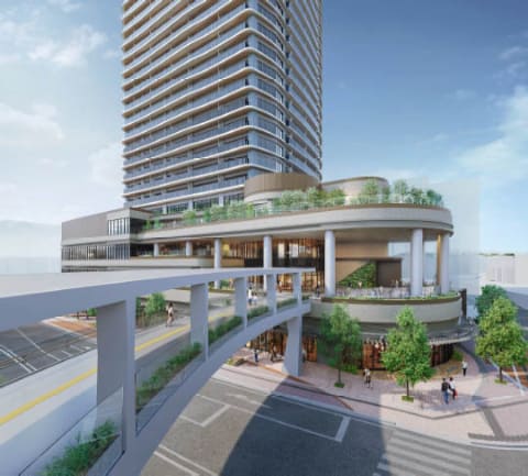 施設開発にあわせ、駅と施設をフラットに接続する歩行者デッキを整備。バリアフリー性の高い昇降機能なども設け、安全で快適な歩行者ネットワークを形成するとしている。