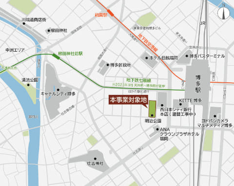明治公園の所在地は福岡市博多区博多駅前三丁目45、敷地面積は約3,572m2。開園日や店舗の詳細等については5月頃の発表を予定している。
