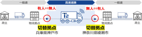 綾瀬スマートICと神戸西ICの近くには、T2がレベル4を見据えた設備として、高速道路における自動運転と、一般道における有人運転を切り替えるためにドライバーがトラックに乗り降りする「切替拠点」を今春完成させる予定。今後、こうした切替拠点の間も自動運転のままで走行できるよう、幅の狭さから走行の難易度が高いとされる料金所の通過や、料金所と切替拠点を結ぶ一般道の走行も可能にする技術開発を進める。