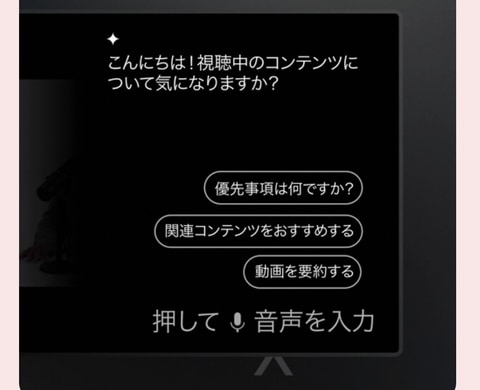 今回のアップデートにより、対象の動画には、Geminiのマークの「質問する」ボタンが追加される。ボタンをクリックすると画面端にツールエリアが開き、テンプレートから質問を選択可能。リモコンのマイクを利用して声で直接質問することもできる。動画を一時停止することなく、動画の関連情報をGeminiを使って調べられる機能になっている。