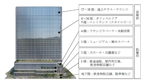 地上28階建て・地下4階・塔屋2階、高さ約160mで構成される新オフィス。地下には飲食物販店舗、1階は屋内外広場、2階は大ホール・会議室、3階はミュージアム・展示スペースで構成する。