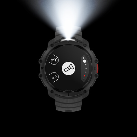 ポラール製品として初めてLEDフラッシュライトを搭載。日常のライトとしてのほか、色は白と赤に切り替えられ、夜間のランニング時に使用して安全性を高めることもできる。