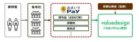 バリューデザインは4月、京都仏教会と共同開発した寺院・神社専用のキャッシュレス決済サービス「おまいりPay」を提供開始した。4月時点では京都の慈照寺(銀閣寺)、永観堂禅林寺、相国寺承天閣美術館で導入し、順次拡大する。拝観料への対応は2026年7月を予定する。