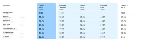 業界標準のベンチマークテストでは、Gemma 4の20倍のサイズのモデルを凌駕する性能を示すなど、「パラメータあたりの知能」が大幅に向上。Androidデバイスから開発者用のワークステーションまでさまざまなハードウェアで効率的に動作できる。