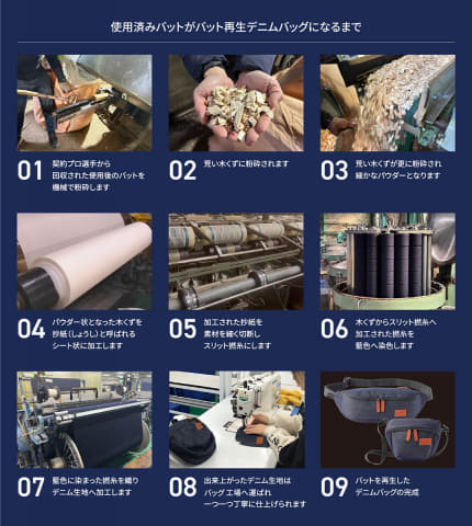 メイン素材にはバット再生デニムを使用。契約プロ選手から回収した使用後のバットを細かなパウダーになるまで粉砕し、パウダー状の木くずを抄紙(しょうし)と呼ばれるシート状に加工する。そこからスリット撚糸(ねんし)へと加工し、藍色に染色した後にデニム生地にする。