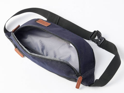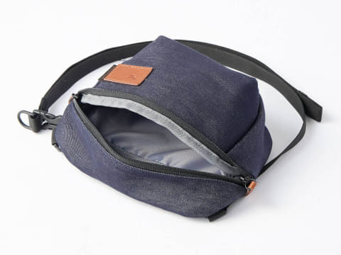 カラーはネイビー。ファスナーとロゴにはグラブ革の端材を使用し、アクセントにしている。