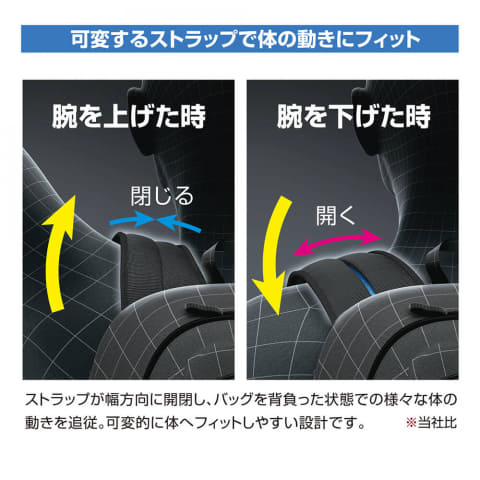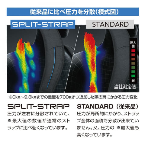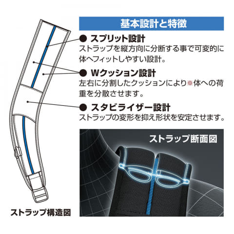ショルダーベルトに、ミズノの特許技術「SPLIT-STRAP(スプリットストラップ)」を採用。ショルダーベルトの分割設計で荷重を分散するという。肩にフィットしやすい角度設計とも連動し、軽量感を生み出すことで、身体への負担を軽減するとしている。